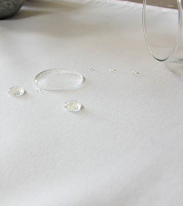 Confecționată dintr-un amestec dens de bumbac și poliester, combină finețea naturală cu durabilitatea fibrelor sintetice. Suprafața este tratată cu un efect hidrofug, ceea ce face ca lichidele să nu fie absorbite imediat, ci să se adune în picături ușor de îndepărtat cu o lavetă. Materialul este rezistent la murdărie și spălări frecvente, menținându-și textura și nuanța crem elegantă chiar și după utilizare intensă.